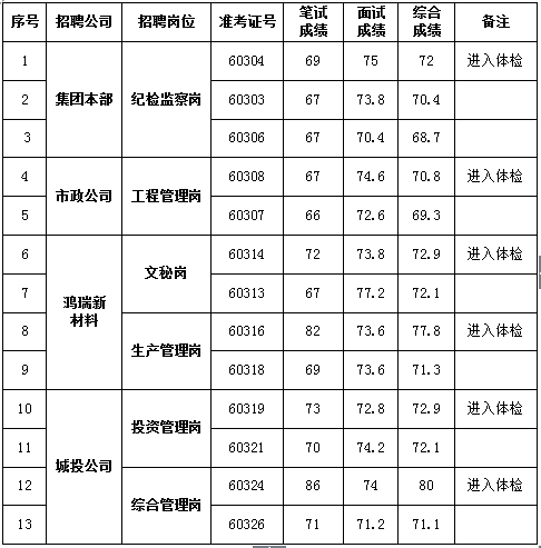 黃山市徽城投資集團(tuán)招聘員工面試工作已于2019年12月15日結(jié)束,現(xiàn)將面試成績及最終綜合成績公布如下: